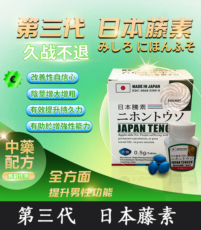 日本藤素(Japan Tengsu)是一款專為男性設計的純天然補養產品,以改善性功能障礙、增強體力與延時助勃為主要訴求。產品標榜不含西藥成分,適合用於保養腎功能、提升性能力與性慾表現。